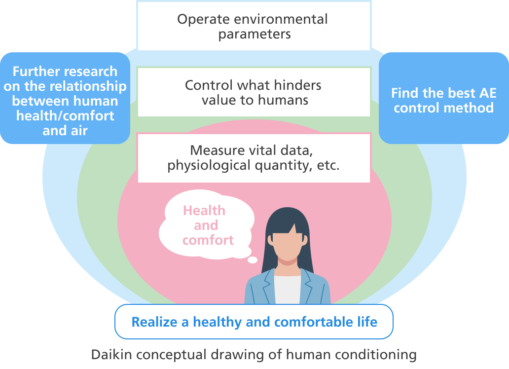 The research theme of the group is “Everything but heating and cooling.” For example, to provide air with high added value, the group conducts research that measures how air affects people in all daily activities of their lives including “concentrating, relaxing, sleeping, and eating.”